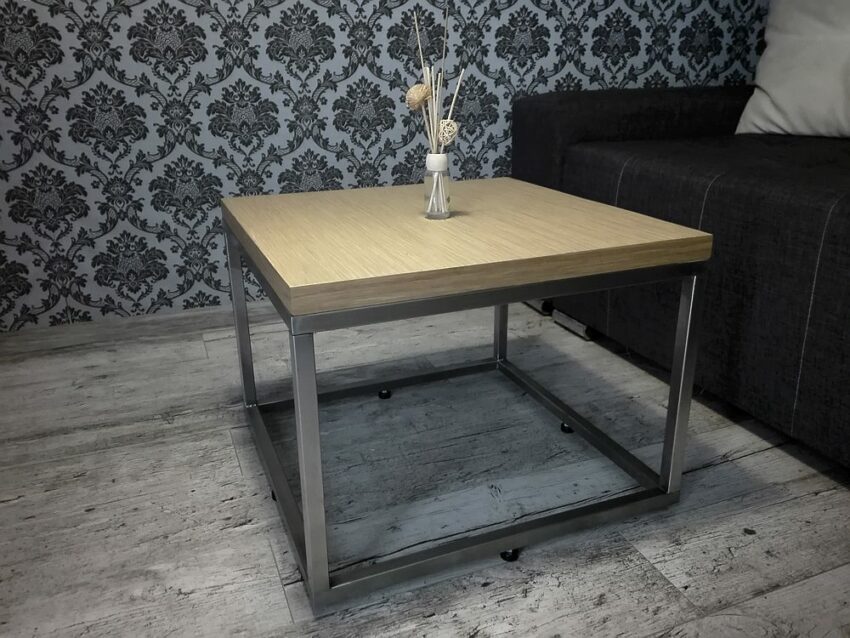 Stelaż to zespawane, nierdzewne profile stalowe, do których przymocowałem blat z płyty meblowej o grubości 3 cm, oklejony fornirem dębowym, zabezpieczony bardzo odpornym lakierem bezbarwnym. Stolik osadzony jest na 4 nóżkach z możliwością regulacji, by mebel nie chwiał się na nierównej powierzchni. Wymiary: 50 cm szerokości x 50 cm długości x 38,5 cm wysokości