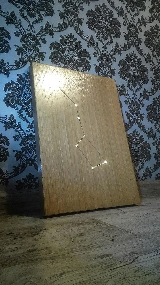 Drewniana ramka wykończona nierdzewną stalą, płyta MDF oklejona dębioną pokrytą połyskliwym lakierem, podklejona przezroczystą plexi. W środku taśma LED, która podświetla wycięty wzór Wielkiego Wozu. Całość zasilana 3 bateriami AA.
