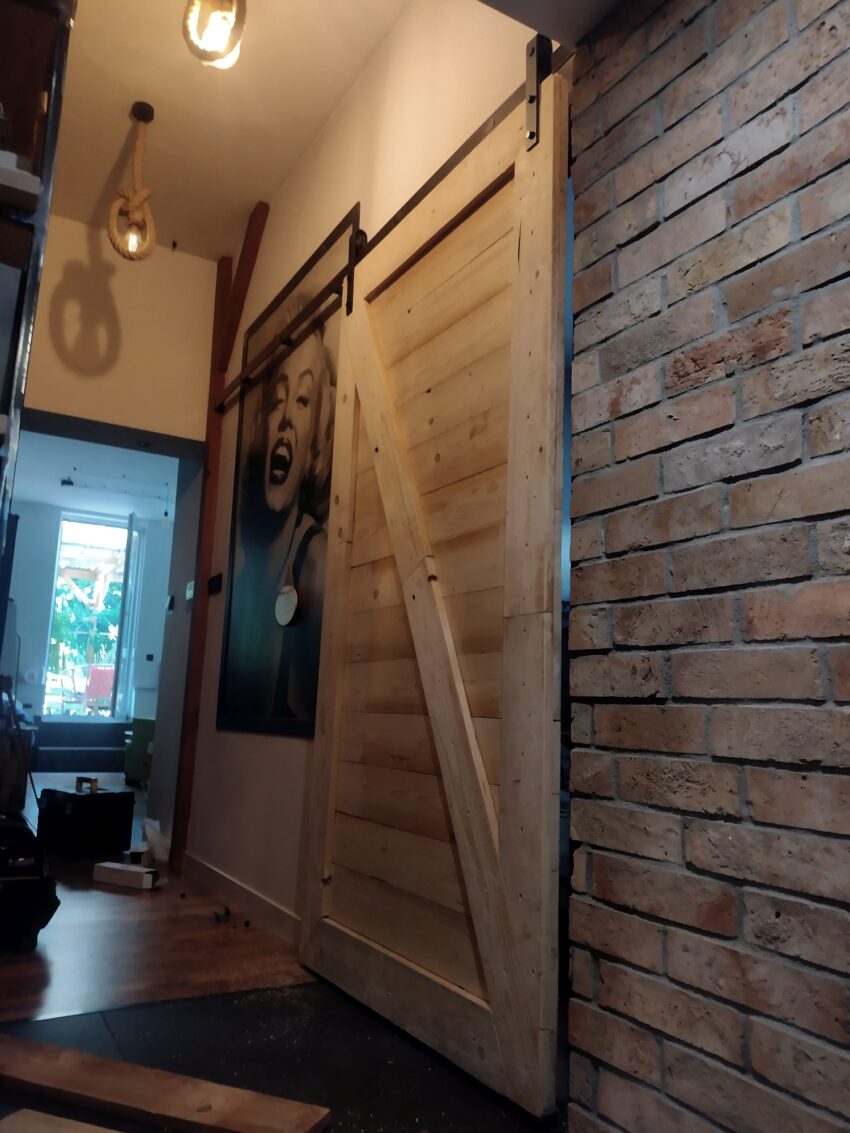 Drzwi wykonane zostały z prostych konstrukcji drewnianych, używanych do przekładania towaru na paletach. Z założenia miały być proste i surowe, pasujące do wnętrza pełnego cegieł i metalowych elementów wystroju wnętrza. Były to pierwsze drzwi wykonane przeze mnie, w dodatku zawieszone na rolkach przesuwanych po prowadnicy.