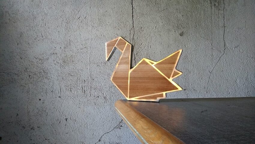 Ozdobę na półkę w kształcie łabędzia wykonałem z płyty MDF oklejonej fornirem dębowym. Trafiła ona na plexi. W kilku miejscach pod nią znalazły się dystanse z drewna, by zapewnić przestrzeń potrzebną na taśmę LED na baterie przyklejoną na obwodzie łabędzia. Tłem znów była płyta MDF oklejona folią aluminiową, by dobrze odbijać światło. Boki całości to…