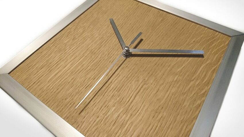 Połączenie surowego metalu – aluminium – z ciepłem naturalnej okleiny dębowej. Do tego surowe aluminiowe wskazówki przetarte papierem ściernym o wysokiej gradacji. Fornir przyklejony do płyty MDF.