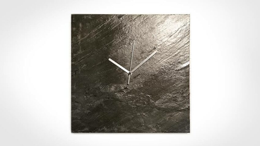 Bardzo realistyczny laminat przypominający naturalny, ciemny kamień z mnóstwem nierówności i pęknięć. Do tego „szczotkowane” aluminiowe wskazówki wskazówki.
