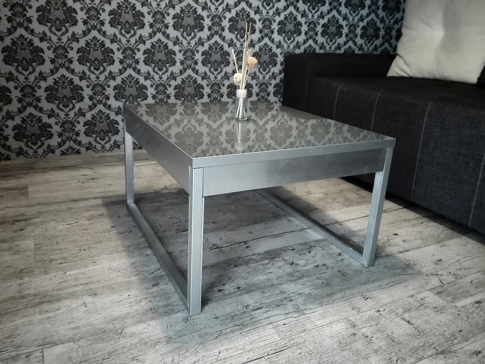 Wykonany w większości z surowego oraz anodowanego aluminium. Sam blat jest natomiast szklany.