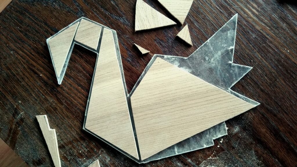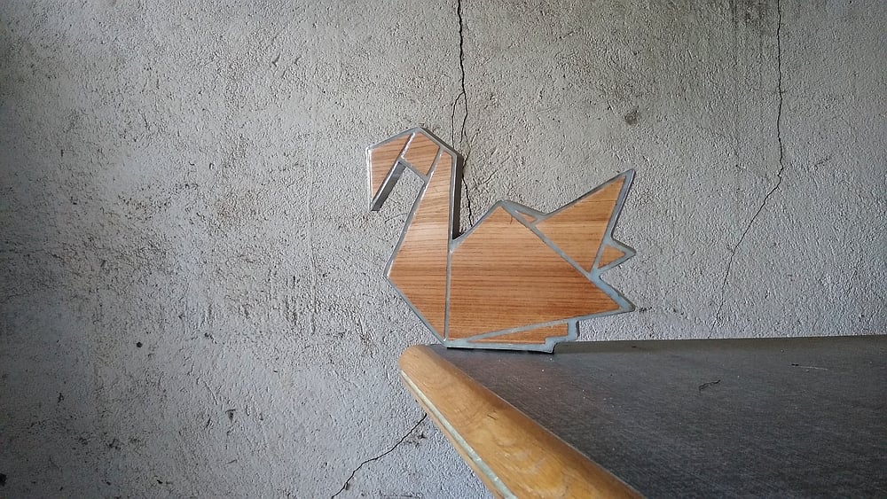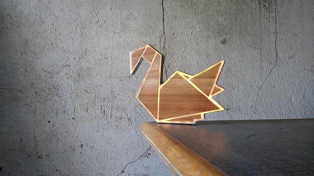 Ozdobę na półkę w kształcie łabędzia wykonałem z płyty MDF oklejonej fornirem dębowym. Trafiła ona na plexi. W kilku miejscach pod nią znalazły się dystanse z drewna, by zapewnić przestrzeń potrzebną na taśmę LED na baterie przyklejoną na obwodzie łabędzia. Tłem znów była płyta MDF oklejona folią aluminiową, by dobrze odbijać światło. Boki całości to pasek nierdzewnej stali.